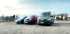 Ein blaues Auto, ein lila Lieferwagen und ein schwarzer MAN-Transporter parken nebeneinander auf einem Schotterparkplatz.