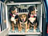 Drei Hunde sitzen in einer Transportbox im offenen Kofferraum eines blauen Vans, einer leckt sich die Nase.